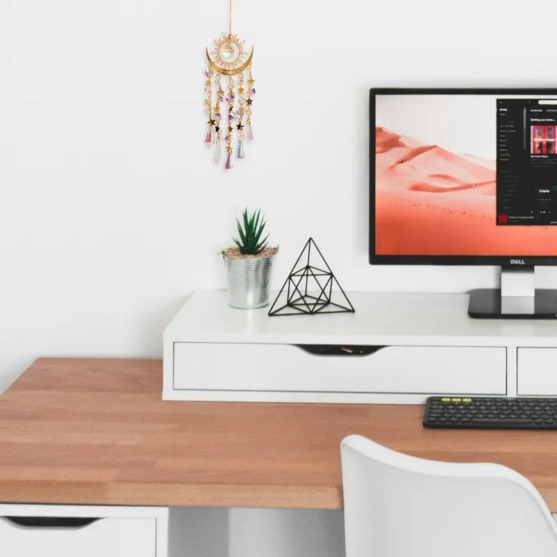 🌈 Rainbow Maker: Suncatcher to mieniąca się metalowa rama z motywami słońca, księżyca i gwiazd. Sztuczne kryształy i zawieszki odbijają światło słoneczne, tworząc zjawiskowy efekt światła i cienia. Unikalny design, kunszt wykonania i wyrazista dekoracyjność czynią z niej urzekające dzieło sztuki.