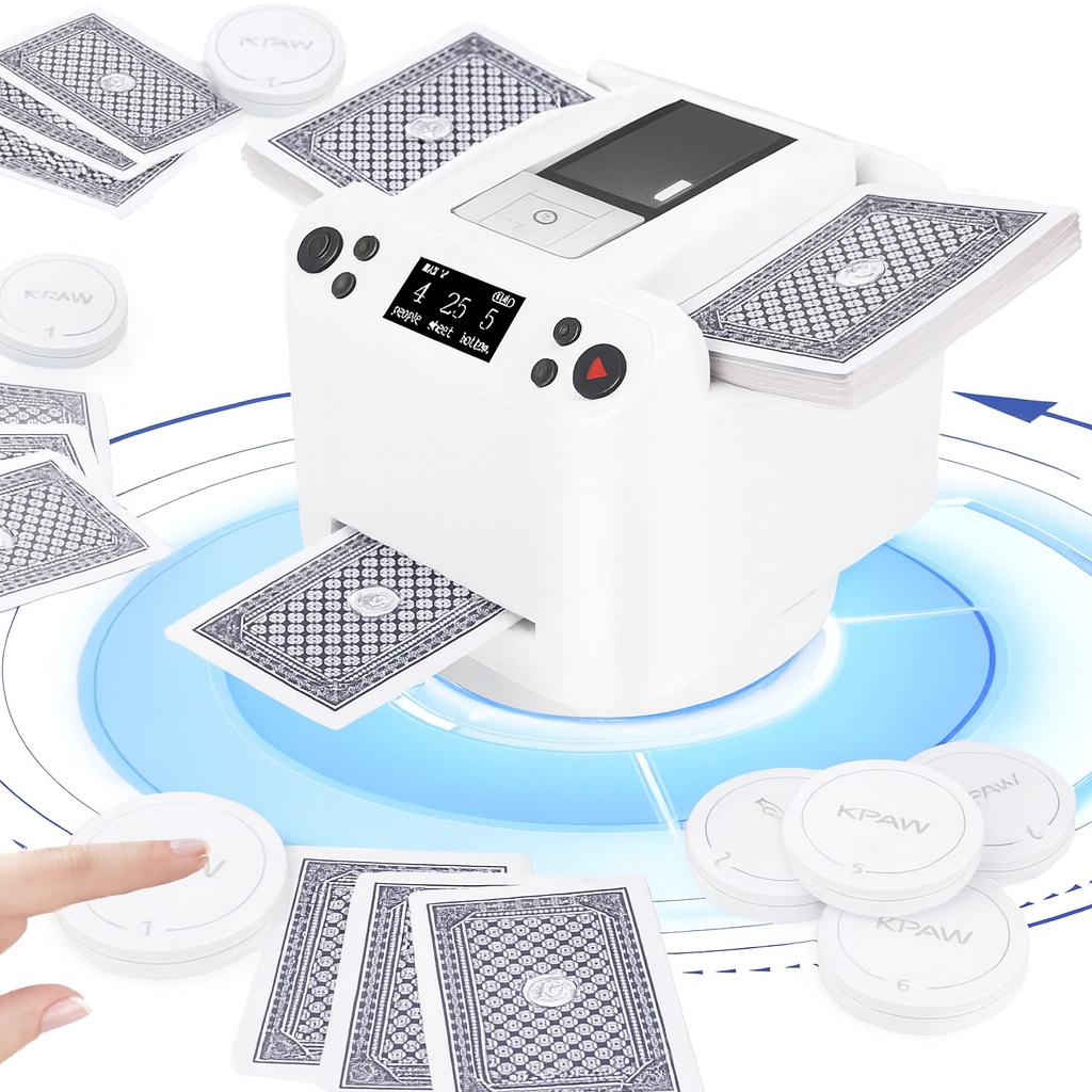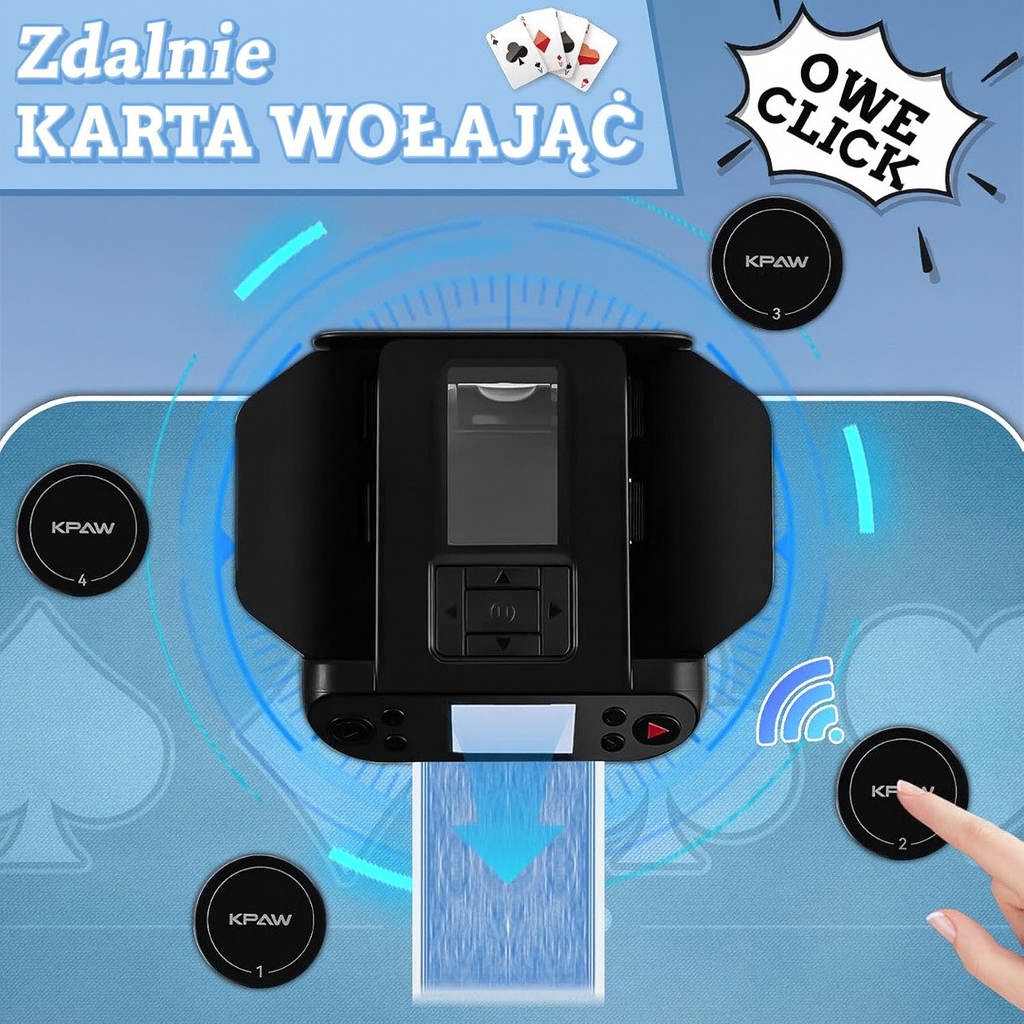- W zestawie bezprzewodowe piloty – w zestawie znajdują się 4 piloty do losowania kart z tarczą (z możliwością rozszerzenia do 12), umożliwiające losowanie bez użycia rąk — idealne do szybkich lub strategicznych gier, takich jak UNO i Rummy.