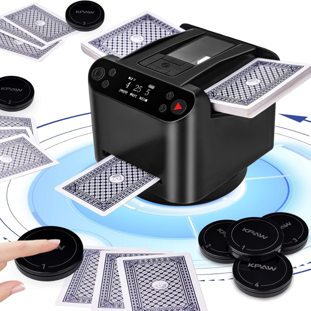 MAX6 to prawdziwe urządzenie 2 w 1: automatycznie tasuje i rozdaje karty po naciśnięciu przycisku — koniec z kłótniami, opóźnieniami i żmudnym, ręcznym tasowaniem .