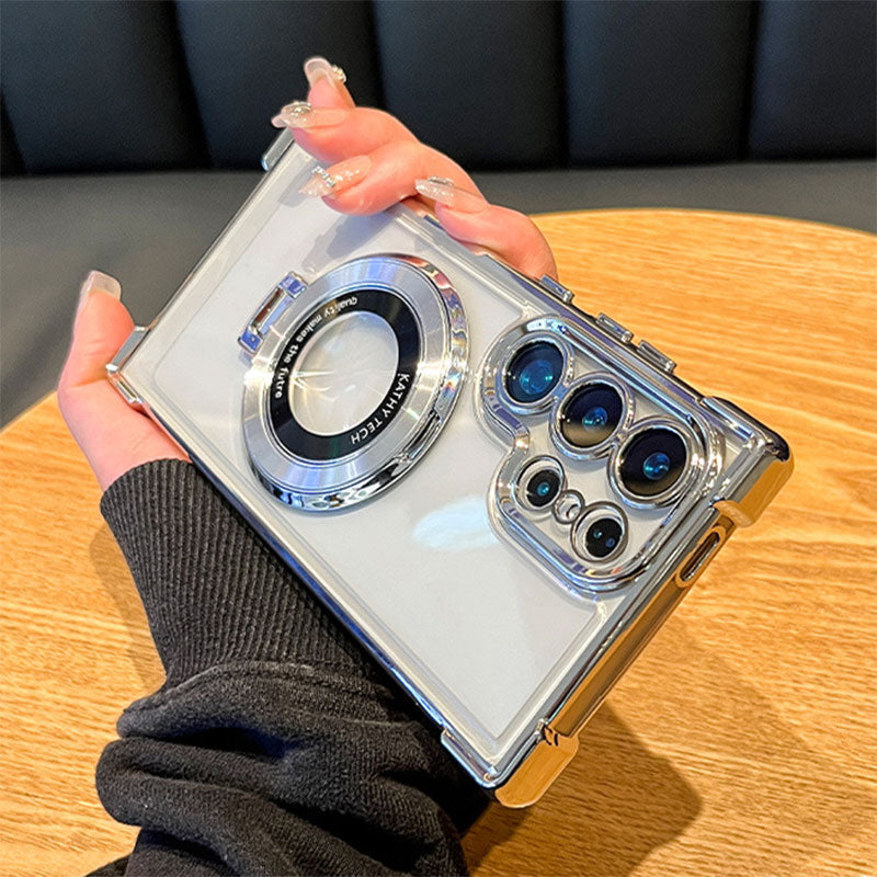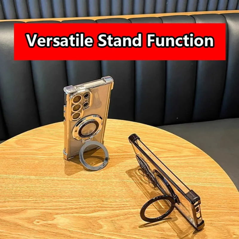NIEWIDOCZNA PODSTAWKA MAGNETYCZNA: Jest to nowa seria, która oferuje funkcję magnetycznego pierścienia i podpórki dla telefonu. Gdy jest otwarty, wbudowany aluminiowy pierścień magnetyczny stoi stabilnie w trybie pionowym lub poziomym, a gdy jest złożony, tył jest całkowicie niewidoczny (nie uniemożliwiając korzystania z ładowania magnetycznego). Świetnie nadaje się do użytku na biurku lub w dowolnym miejscu podczas pracy lub korzystania z multimediów!